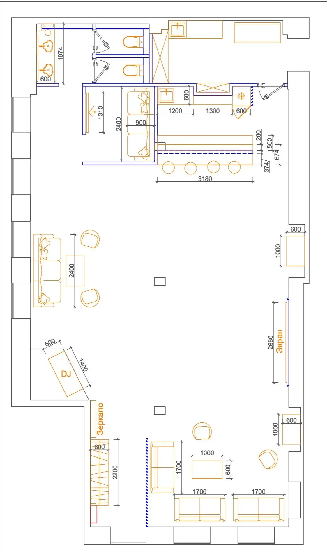 Банкетный стол, зона игр на приставке, диваны, танцпол, бар